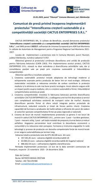 Comunicat de presă CACTUS ENTERPRISES SRL