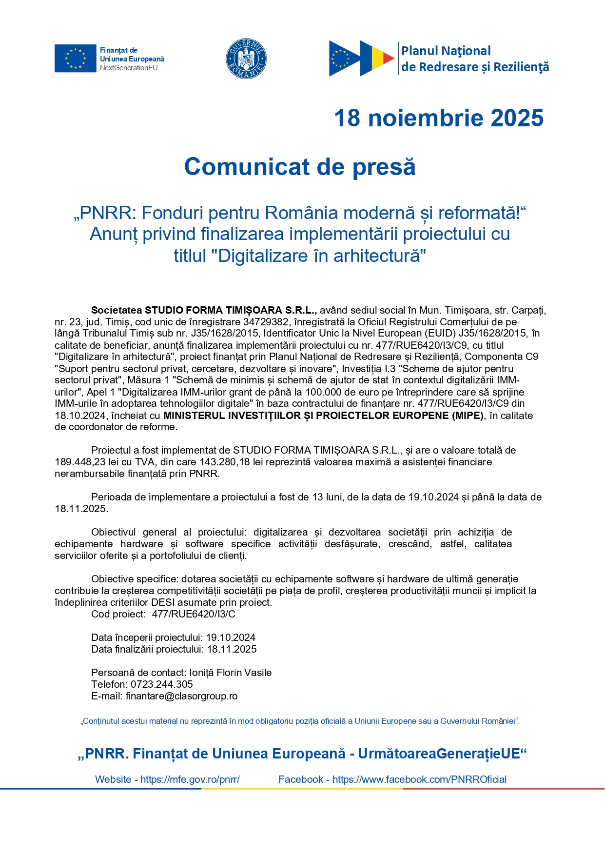 Comunicat de presă STUDIO FORMA TIMIȘOARA S.R.L.