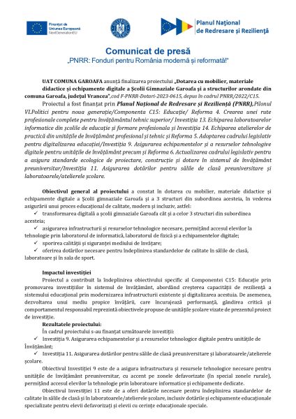 Comunicat de presă UAT COMUNA GAROAFA - Ziarul National