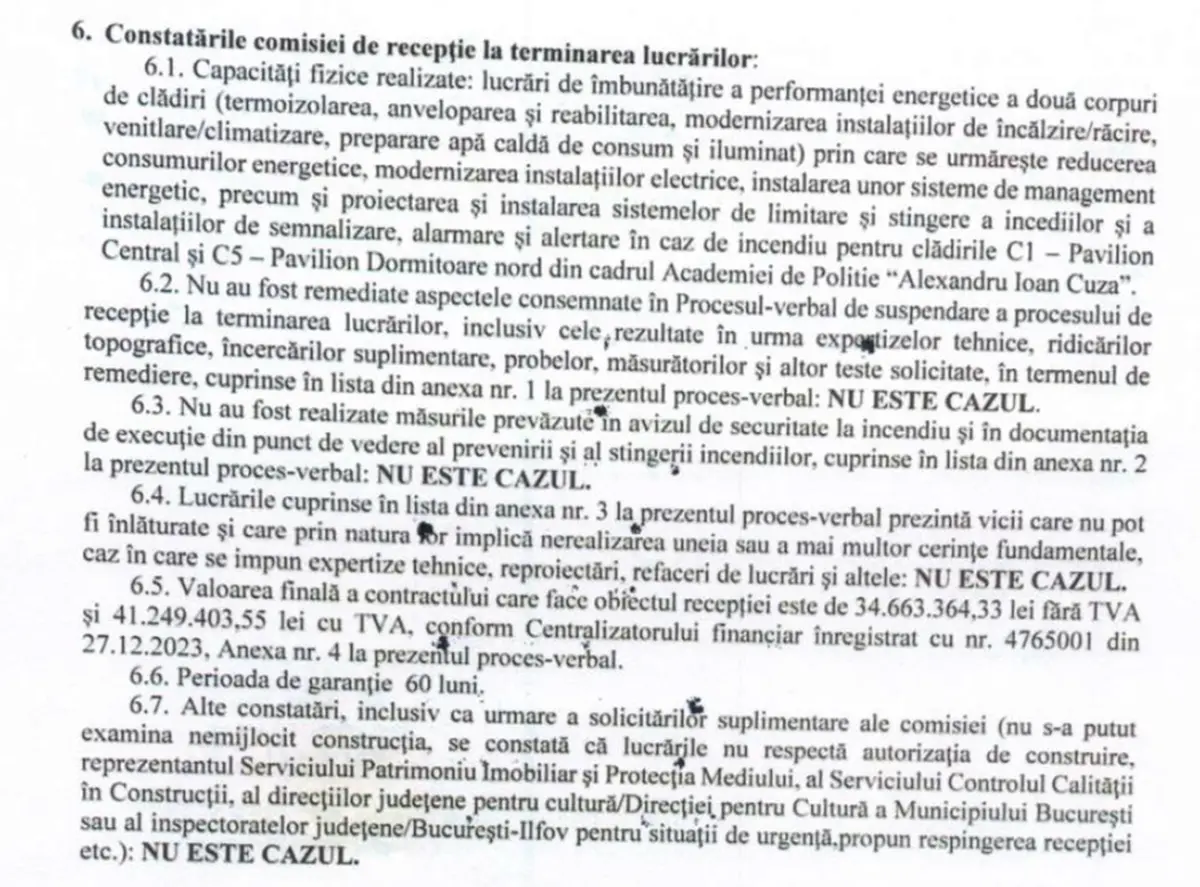 ”După câțiva ani de lucrări, pe 28 decembrie 2023, cu doar trei zile înainte de închiderea oficială a programului POR, s-a întrunit o comisie de recepție care a semnat Procesul-Verbal de Recepție la Terminarea Lucrărilor, document pe care am reușit să punem și noi mâna. Capitolul 6 arată că proiectul a mers șnur, formularul tip încheindu-se cu formularea scurtă: <<Nu este cazul>>. Astfel, la punctul 8, comisia își motivează decizia de a admite recepția declarând că <<Lucrările executate sunt de calitate și corespund prevederilor proiectului ethnic>>. Constructorul (o asociere condusă de SC BAU STARK SRL) și-a văzut contractul încheiat, iar Academia a primit o clădire reabilitată <<de calitate>>, cu o garanție confortabilă de 60 de luni (5 ani)”, a precizat Sindicatul Polițiștilor ”Diamantul”.