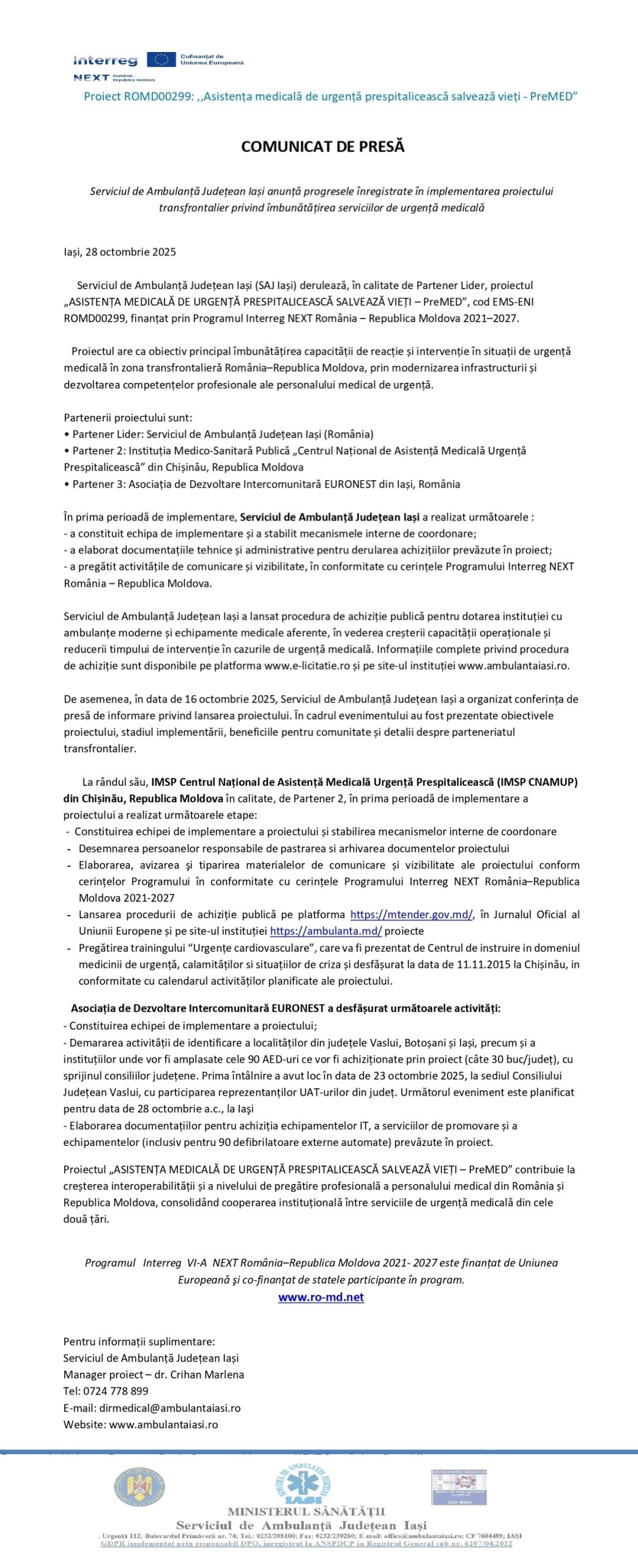 COMUNICAT DE PRESĂ (ARTICOL) pentru proiectul „ASISTENȚA MEDICALĂ DE URGENȚĂ PRESPITALICEASCĂ SALVEAZĂ VIEȚI – PreMED”, cod EMS-ENI ROMD00299, finanțat prin Programul Interreg NEXT România – Republica Moldova 2021–2027