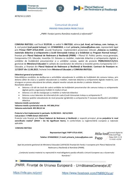 Comunicat de presă COMUNA IRATOȘU