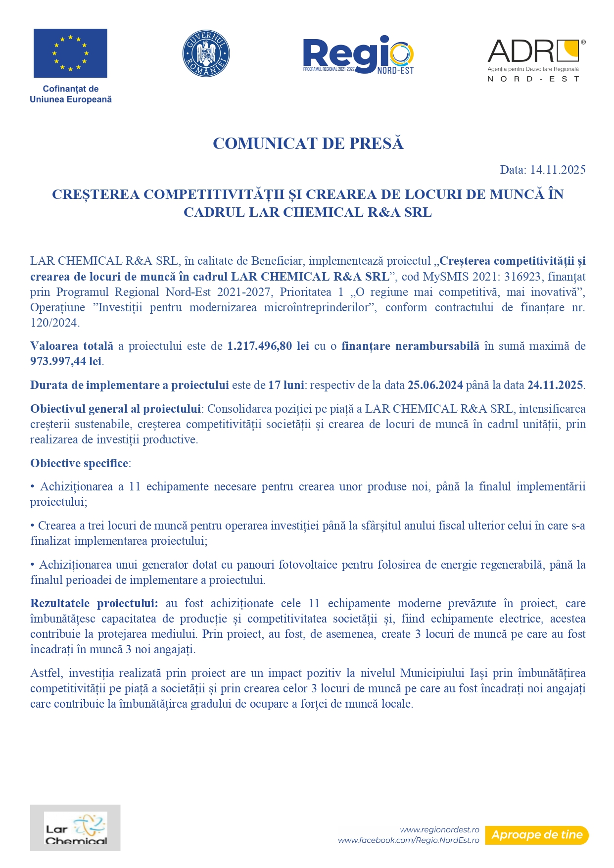 COMUNICAT DE PRESĂ CREȘTEREA COMPETITIVITĂȚII ȘI CREAREA DE LOCURI DE MUNCĂ ÎN CADRUL LAR CHEMICAL R&aA SRL