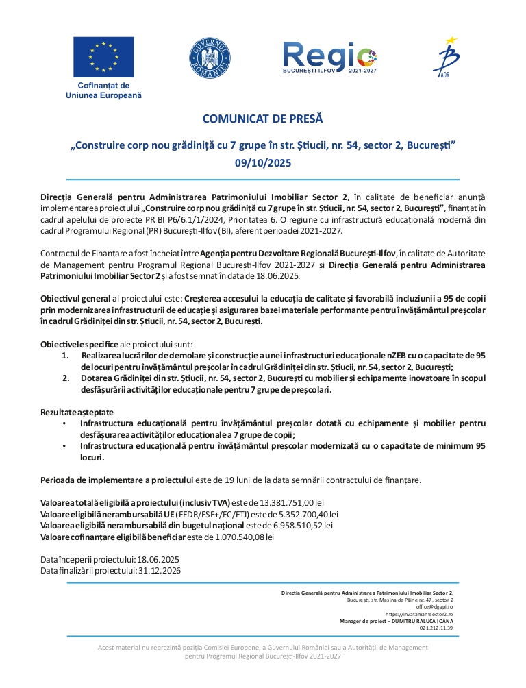Comunicat de presă Direcția Generală pentru Administrarea Patrimoniului Imobiliar Sector 2