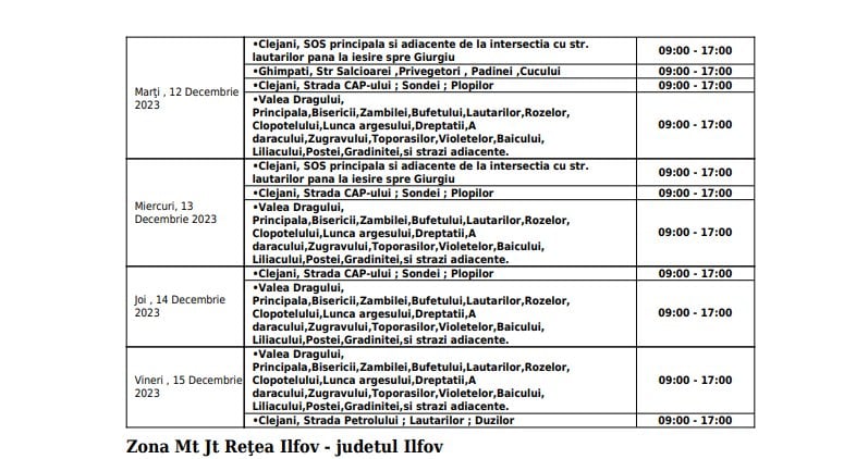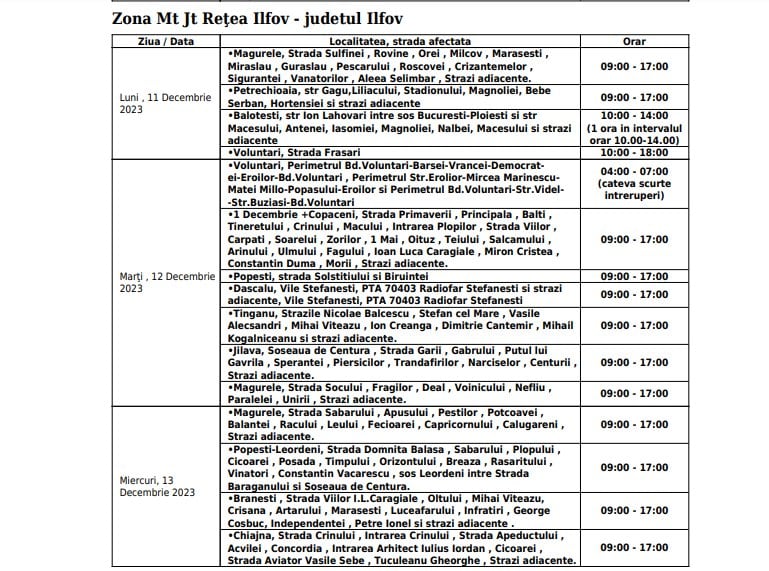Românii din câteva localităţi sunt anunţaţi că vor rămâne „pe întuneric”, succesiv, în săptămâna 11-15 decembrie. De ce? Pentru a asigura capacitatea rețelei de a funcționa și alimenta clienții în bune condiții.