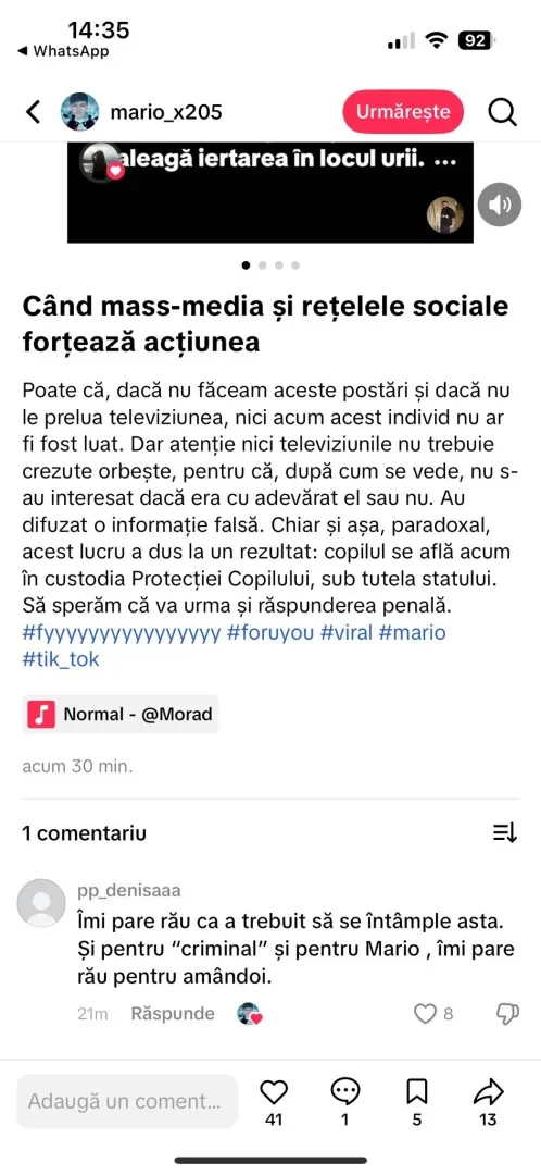 Cont fals pe Tik Tok, în numele băiatului de 13 ani suspectat în cazul crimei de la Cenei