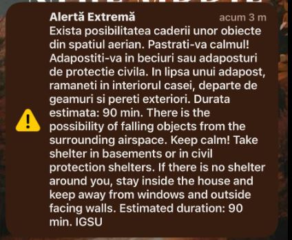 „Dimineață la ora 06.54 a fost transmis mesajul RO-Alert pentru cetățenii din județul Tulcea. O țintă aeriană a intrat din Ucraina în spațiul aerian al României în dreptul localității Periprava, iar după câteva minute a părăsit spațiul aerian românesc prin zona localității Chilia Veche. Acolo a fost și ultimul contact vizual cu această țintă aeriană pe care l-au avut piloții de pe avioanele de urmărire Eurofighter Typhoon.