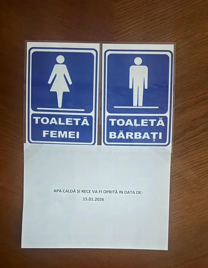 Un anunț a fost pus pe ușile de la băile din incinta clădirii – în care se menționează cu majuscule, să fie, cel mai probabil, cât mai vizibil – faptul că „apa caldă și rece va fi oprită în data de 15.01.2026”.