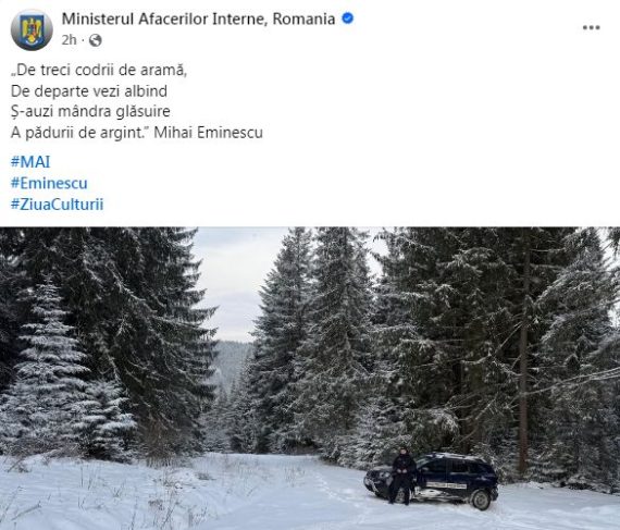 ‘„De vezi codrii de aramă/ De departe vezi albind/ Ş-auzi mândra glăsuire/ A pădurii de argint.” Mihai Eminescu „De ce nu-mi vii”’, a fost postarea inițială de pe pagina de Facebook a Ministerului Afacerilor Interne.