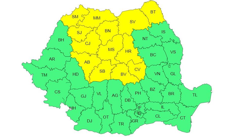 Conform hărții aferente atenționării meteo Cod galben, sunt vizate judeţele Satu Mare, Maramureş, Sălaj, Cluj, Alba, Sibiu, Braşov, Covasna, Harghita, Mureş, Bistriţa-Năsăud, Suceava şi Botoşani.