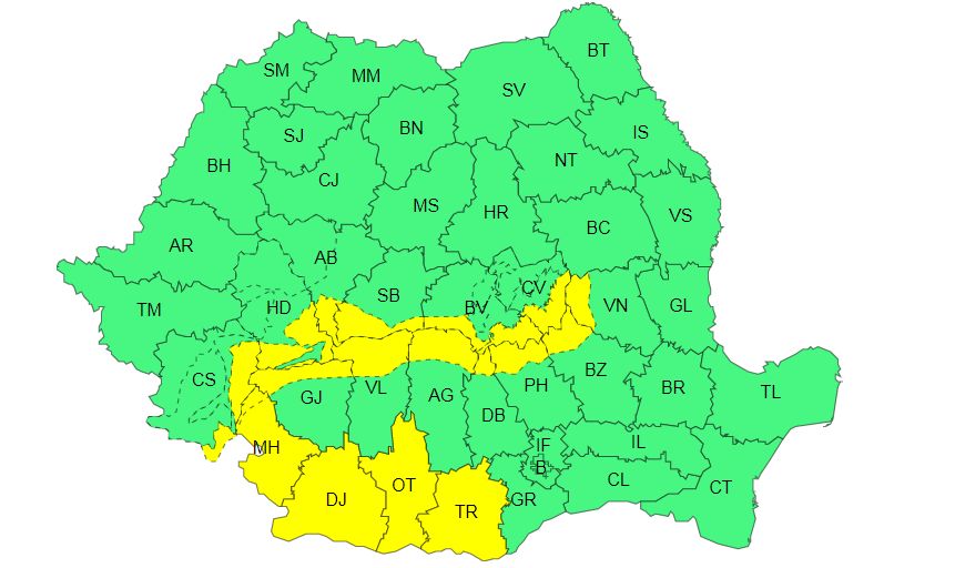 O primă atenționare Cod galben emisă de Administrația Națională de Meteorologie este valabilă marți, 30 decembrie, în intervalul orar 10 – 20, perioadă în care, potrivit specialiștilor ANM, în vestul și sudul Olteniei și în sud-vestul Munteniei vor fi intensificări ale vântului cu viteze de 50…70 km/h.